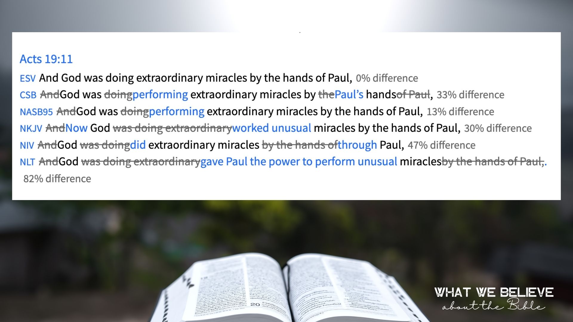 Here we see both translations have God as active working through Paul, but one interprets the expression hands of Paul as a figure of speech to refer to Paul’s agency. The other retains the word hands, this leaves open the possibility that the text purposefully includes hands. This may be because Paul was doing miracles, such as healing, by laying his hands on others. The NIV can limit this interpretation. I have a chart of various translations for this verse that can be helpful. You see that the NLT makes another interpretive move, which seems to push the main agent from God to Paul and adds the word power. Will these differences prevent us from living a faithful life to the Lord? Absolutely not. In fact, they are minor differences that exist because the translations are trying to do different things. This shouldn’t cause us to lose confidence but to recognize the strengths and weaknesses of each approach.