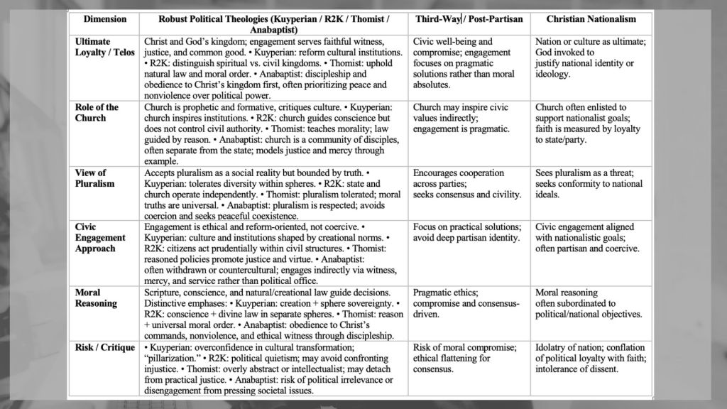 But this does little to provide a solid foundation. It is more descriptive of motivations, which we can’t really judge, than how things go wrong and can slip into an unhealthy approach. I think it is better to ground our approach in a robust political theology. Again, some may still call this the third way, but I think framing it as political theology can help us avoid the starting point of partisanship. A theology of politics examines what all of Scripture teaches regarding ethics and our responsibilities, synthesizes it, and offers a framework from which to engage. We still should evaluate these according to Scripture, but instead of starting from scratch, it can be helpful to adopt one and then seek to evaluate it and continually assess – see this chart in contrast to Christian Nationalism and an ungrounded Third-Way.