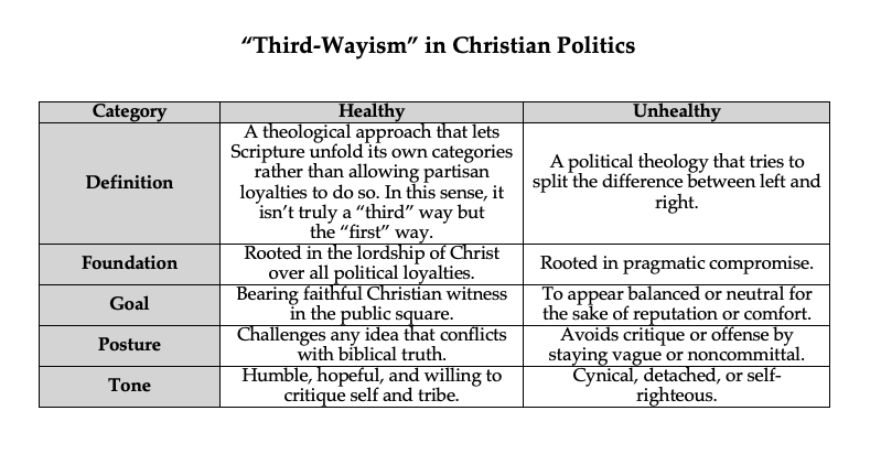 This relates to how Christians enter into our call as citizens through the lens of our primary call to Christ. Some do this via what has been called the third way or post-partisan approach. There are faithful Christians who pursue this method, but I fear that it can lack a proper foundation. It’s true that not every person who adopts this view lacks a foundation, but many do. Patrick Schreiner, a New Testament scholar, recently put up a healthy vs. unhealthy approach to this.
